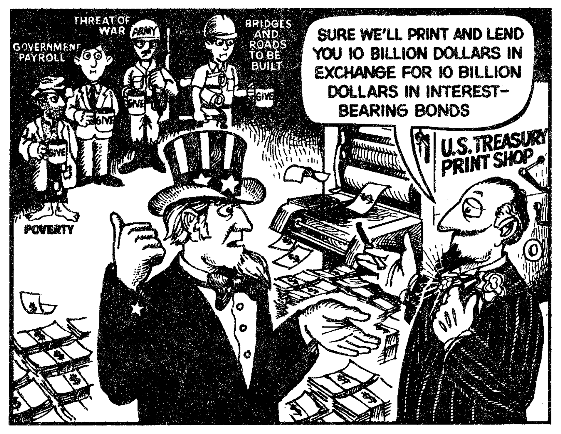 We shall start with the need for money. The Government, having spent more than it has taken from its citizens in taxes, needs, for the sake of illustration, $1,000,000,000. Since it does not have the money, and Congress has given away its authority to “create” it, the Government must go to the “creators” for the $1billion. But, the Federal Reserve, a private corporation, doesn't just give its money away! The Bankers are willing to deliver $1,000,000,000 in money or credit to the Federal Government in exchange for the Government's agreement to pay it back -- with interest! So Congress authorizes the Treasury Department to print $1,000,000,000 in U.S. Bonds, which are then delivered to the Federal Reserve Bankers.