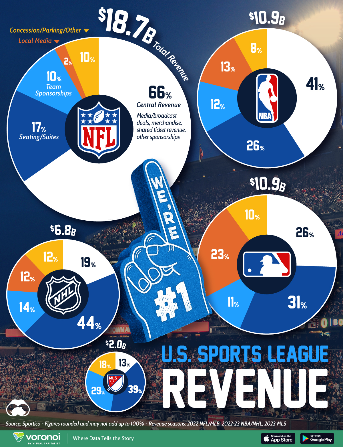 This graphic breaks down U.S. sports leagues by revenue stream, based on data from Sportico.