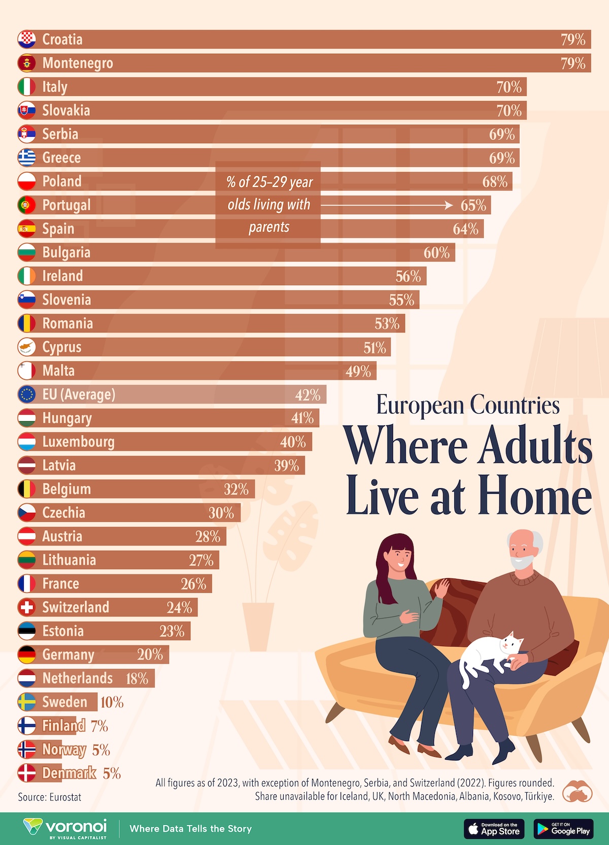 This graphic ranks European countries by the percentage share of those 25–29 years old living with their parents, as sourced from Eurostat (2023).