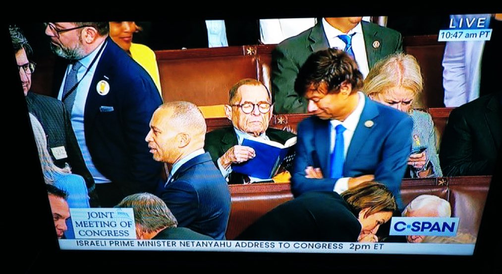 During Netanyahu's speech in Congress, cameras captured Jewish Congressman Jerry Nadler mocking Netanyahu in his own way by reading a book that criticizes Netanyahu.