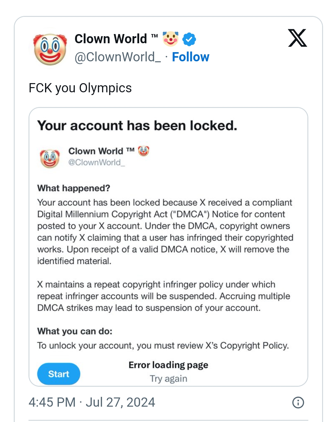 Several X accounts that posted videos and/or screenshots about the absurdities of the Olympics' opening ceremonies have been hit with Digital Millennium Copyright Act (DMCA) complaints enforced by Elon Musk's social media platform.