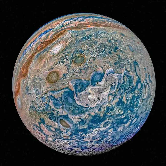 Jupiter by the Juno spacecraft. It looks like a work of art by Vincent van Gogh