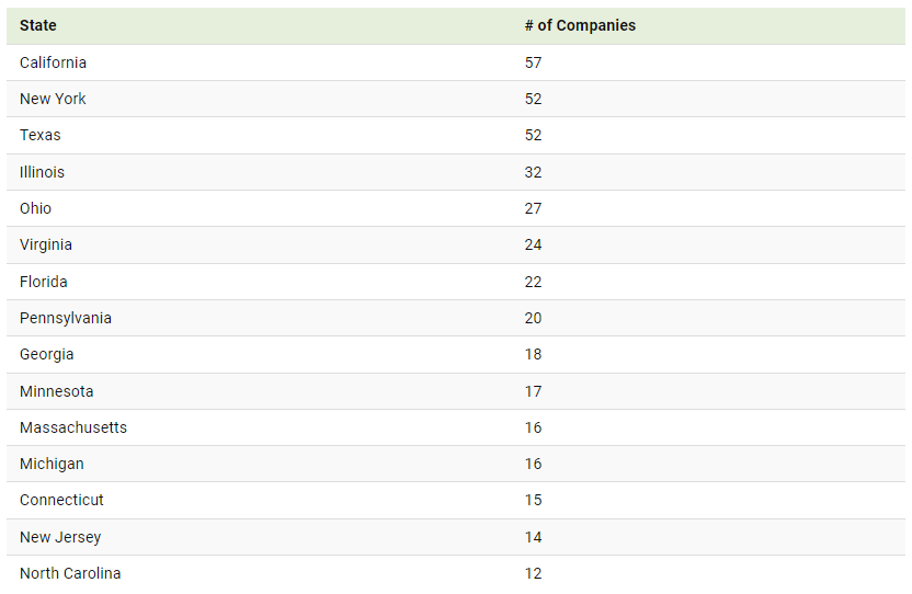 California, which is number one on the list with 57 entrants, is home to tech giants like Apple, Nvidia, and Netflix.