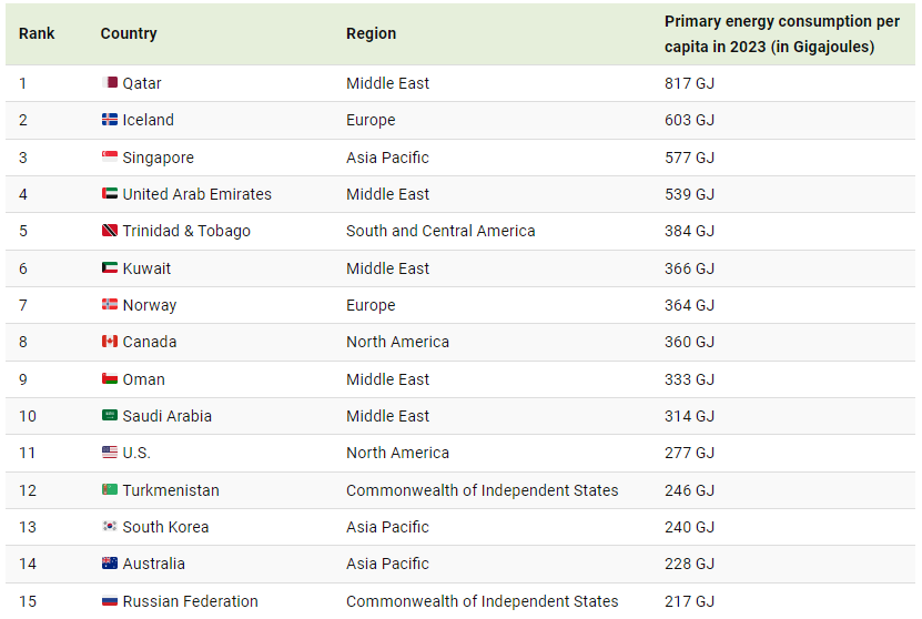 This chart shows the top 15 countries by energy consumption per capita in 2023, as well as the consumption per capita for each global region.