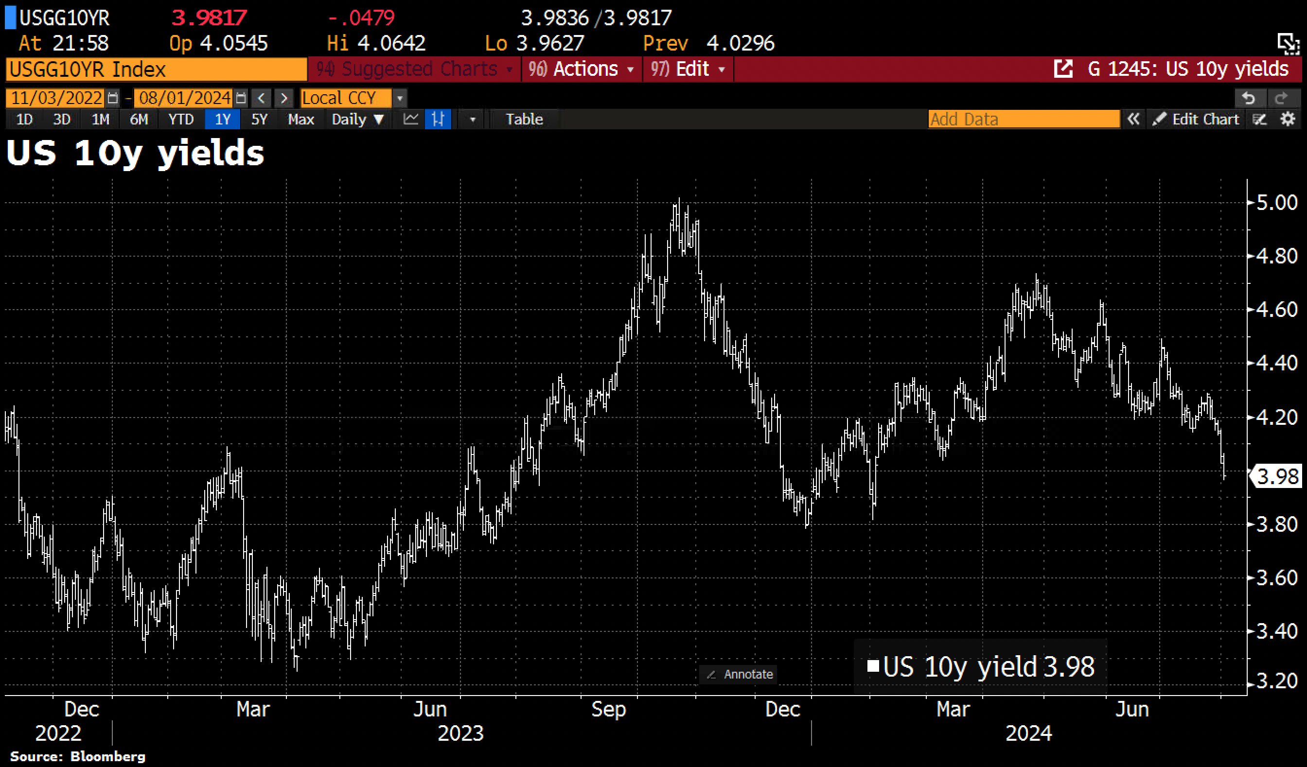 A good barometer for the state of the economy, in addition to the yield curve structure, is above all the general trend in the interest rate level of government bonds. These are currently in free fall and point to a further fall in inflation rates and a noticeable decline in economic activity in the United States. The markets are currently anticipating interest rate cuts this year by the Federal Reserve of 100 basis points. Whether this will actually happen depends on developments on the US labor market, which also appears to have rolled over in the meantime.