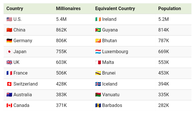 https://m.stacker.news/43873Detailhttps://www.visualcapitalist.com/top-10-millionaire-populations-vs-entire-countries-2024/