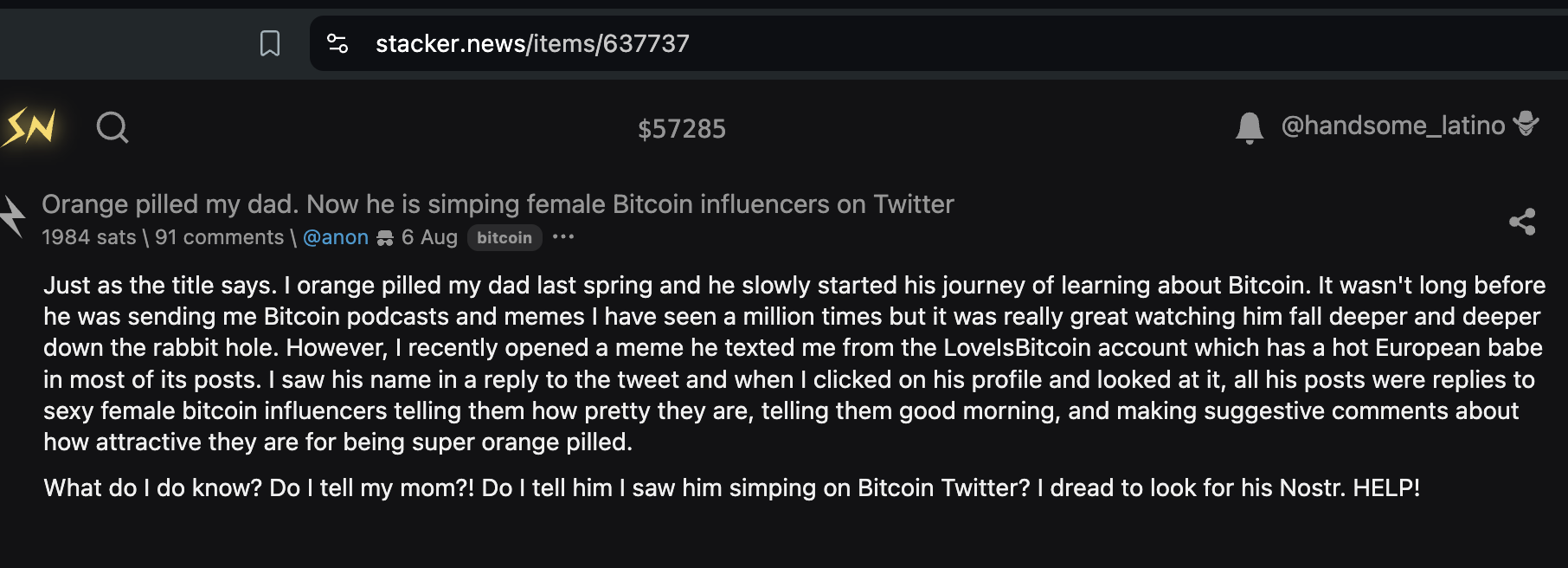 There was a post saying someone orange pilled his dad and then his dad was making uncomfortable advances towards female bitcoiners.