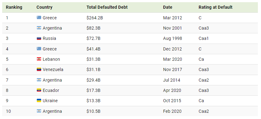 This graphic shows the largest sovereign debt defaults since 1983, based on data from Moody’s via Aswath Damodaran.