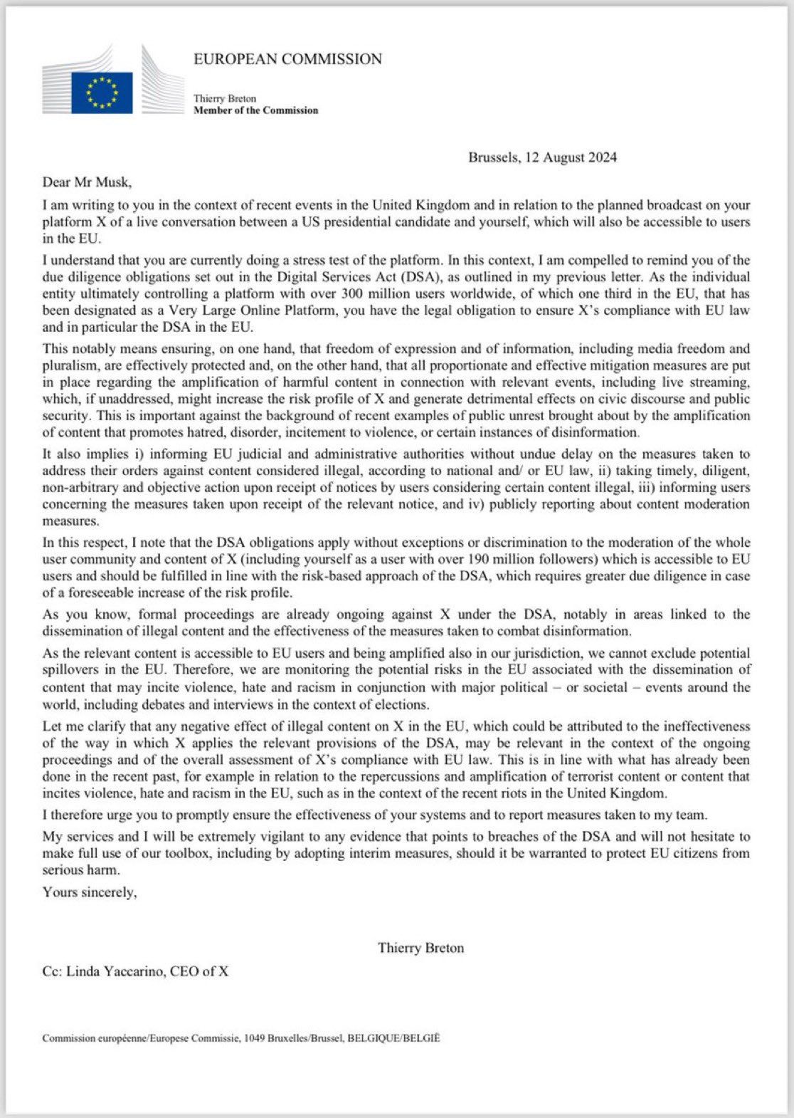 i believe the letter likely addresses specific issues related to how X is managing and moderating content on its platform, especially in the context of recent high-profile discussions or controversies. This might include demands for clearer compliance with EU regulations, requests for more transparency about content management policies, or concerns about specific content or behavior on the platform