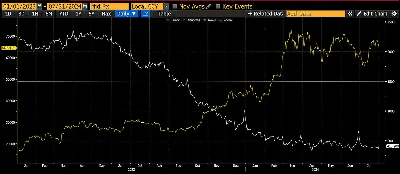 As T-bills are issued and the buyback program operates in the background, liquidity conditions will improve. If Harris is wobbling and needs more firepower in the form of a rip-roaring stock market, Yellen will spend down the TGA. In any case, I expect that crypto will exit its sideways-to-downward trajectory starting in September. As such, I will take advantage of this late northern hemispheric summer weakness to load up on crypto risk.