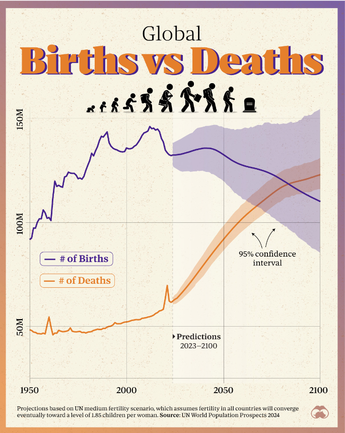 But as birth rates fall around the world, the number of deaths occurring each year is expected to surpass the number of births by 2084. This could potentially kick off an era of global population decline.