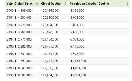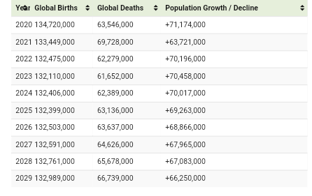 Personally, I believe that it depends on the place or country, the figures are manipulated to suit their convenience. If you ask me, a real example was what happened in the pandemic. All countries and governments published figures and higher figures than they systematically did. It was to cause terror at all levels of society.. and here we must also take into account that while in Europe people do not want children.. however they have 3 dogs 🤦.. on the side here in South America the percentage of mothers teenagers and single girls is galloping upwards... and those same girls end up having 2 or 3 more children... that's where the count can go... and the difference in culture of thought between continents is clear... and I doubt that at some point there will begin to be fewer people in the world... if an atomic bomb is dropped between these countries at war, without a doubt that would reduce it...