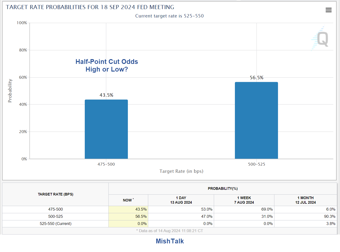 - There is currently a 43.5 percent chance of a 50 basis point cut in September.