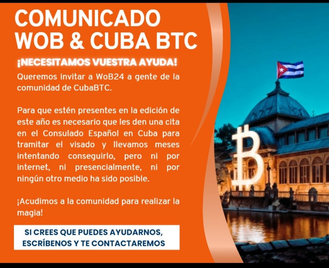 Hacemos un llamamiento a la comunidad y una petición de ayuda para que nuestros compañeros de @Cuba_BTC puedan estar presentes en Madrid en septiembre para #Wob24:
