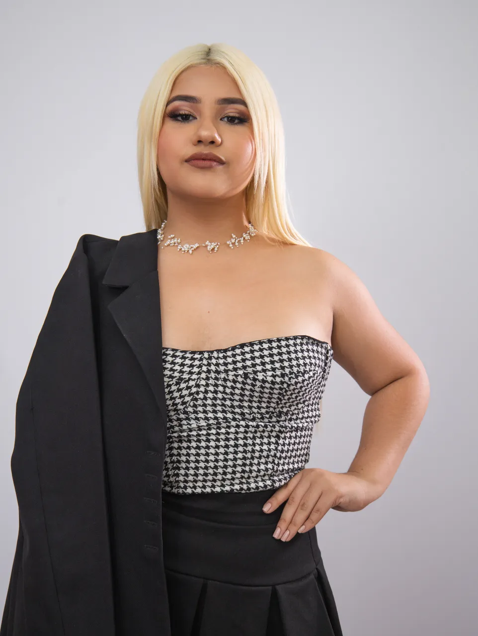 The girl arrived at the studio wearing a very beautiful and quite formal outfit. What I liked most about the outfit was the suit that made her look quite elegant.