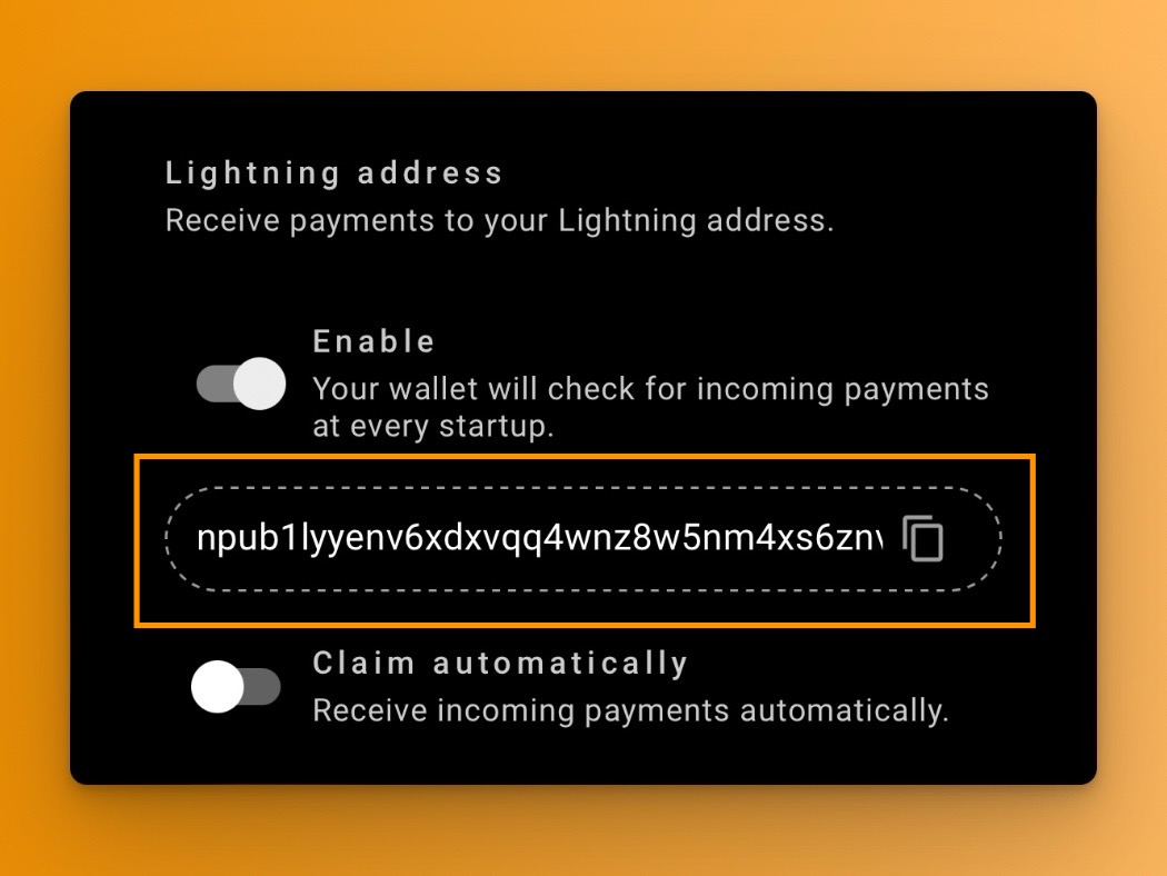 Going back to cashu.me: if you use your nsec, your corresponding long address will be shown in the Lightning address section. Any sats you receive to either that address or the short one will now appear in your wallet.