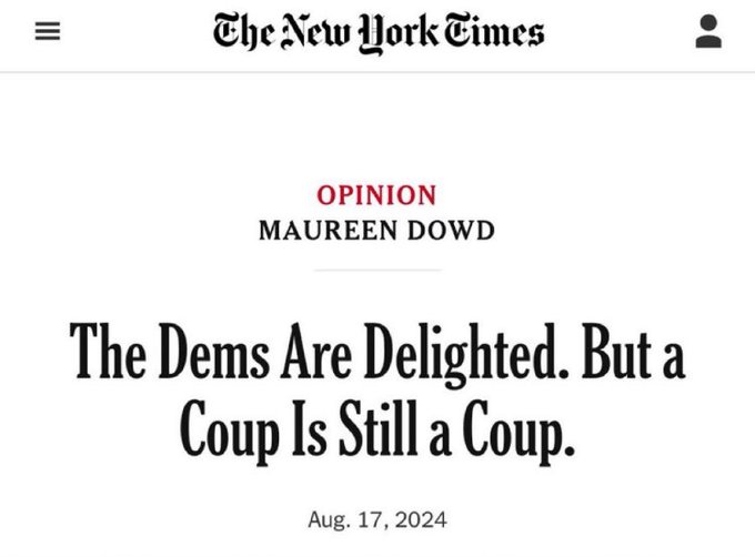 While WaPo is calling out Harris over 'populist gimmicks,' the NY Times' Maureen Dowd slammed Democrats for executing a 'coup' to remove Biden from the 2024 ticket.