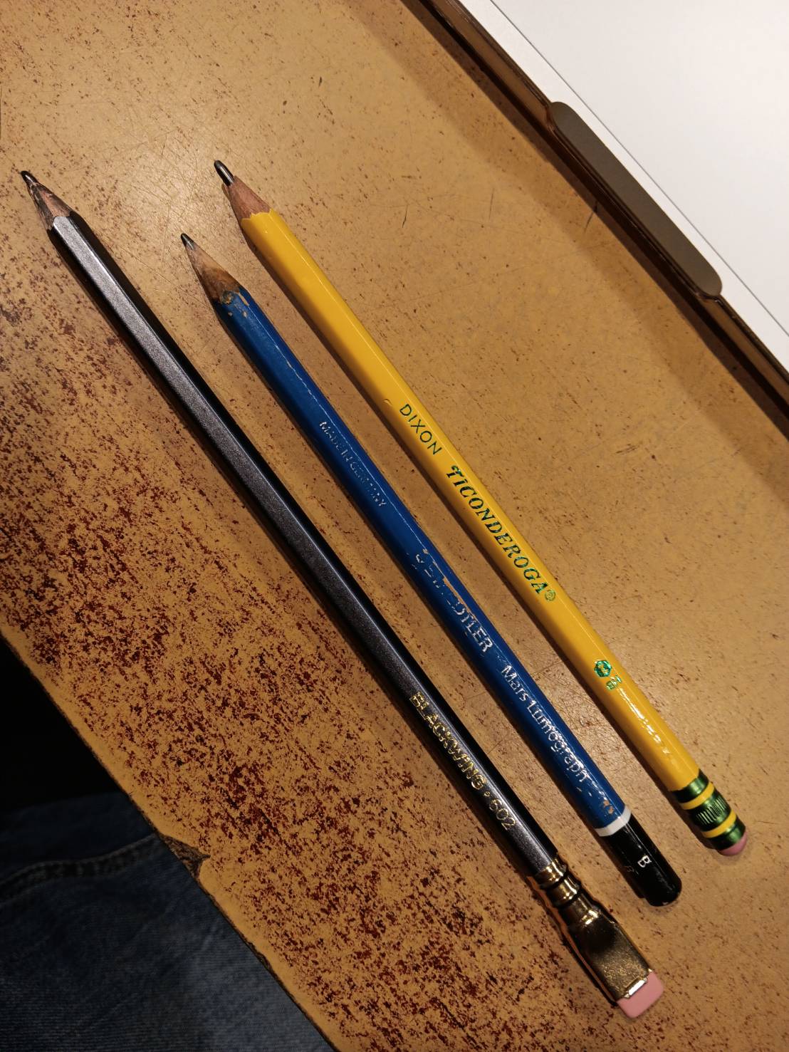 The blue one in the middle is a Mars Lumograph from Staedtler, and you could pick what kind of lead you wanted.