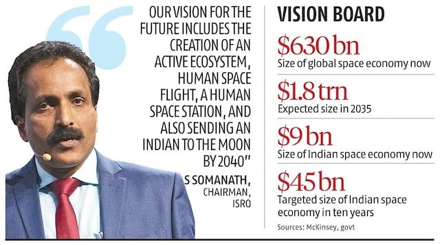 India has outlined an ambitious 25-year vision plan for the space sector, which includes increasing the size of the space economy from around 2 per cent globally to 10 per cent in the next decade, setting up a human space station, and sending an Indian to the Moon by 2040.
