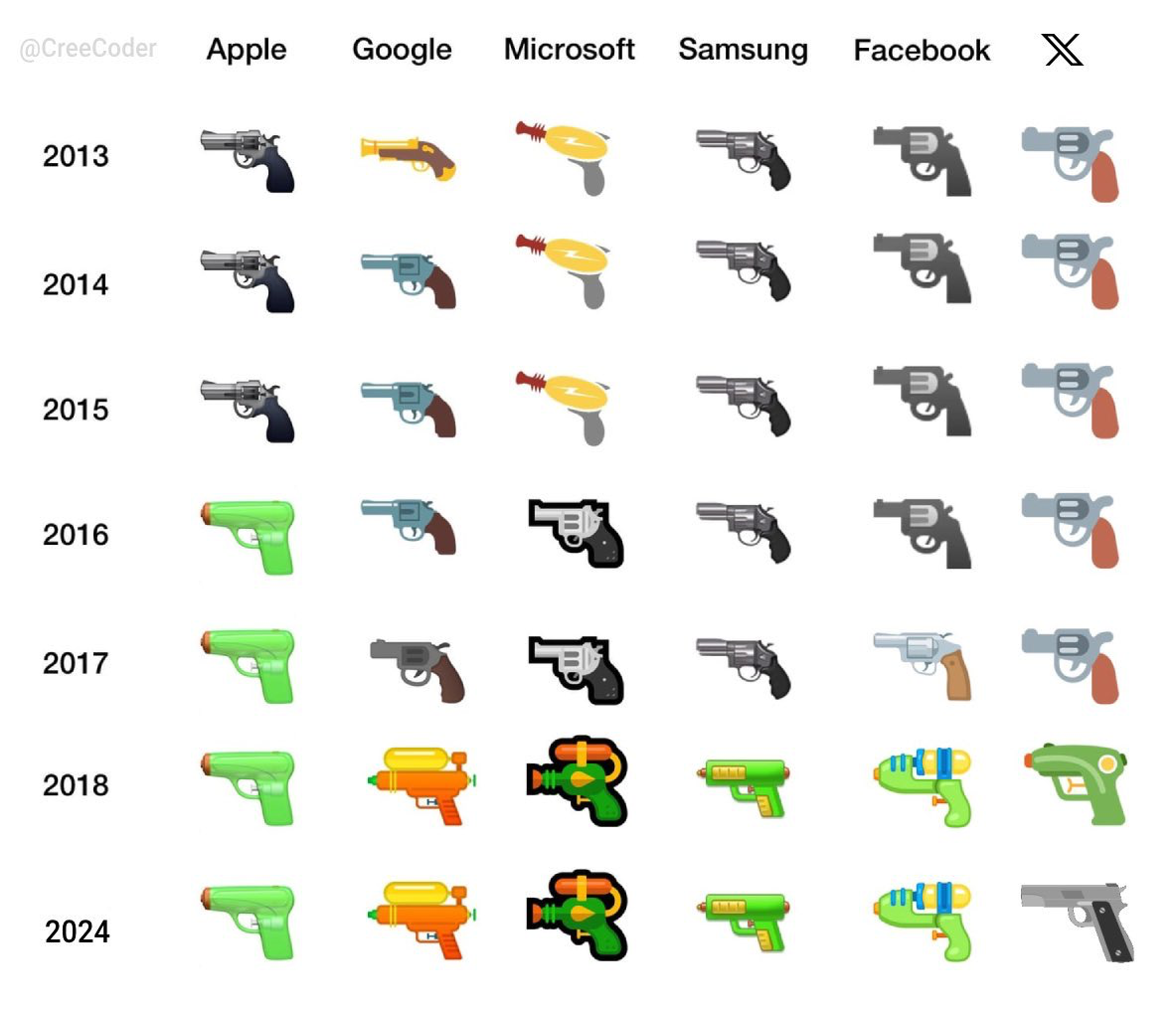 So did they think less people were going to use guns or something when they changed the emoji to a squirt gun? I genuinely also am curious what Jack Dorsey went along with all these liberal changes at X.