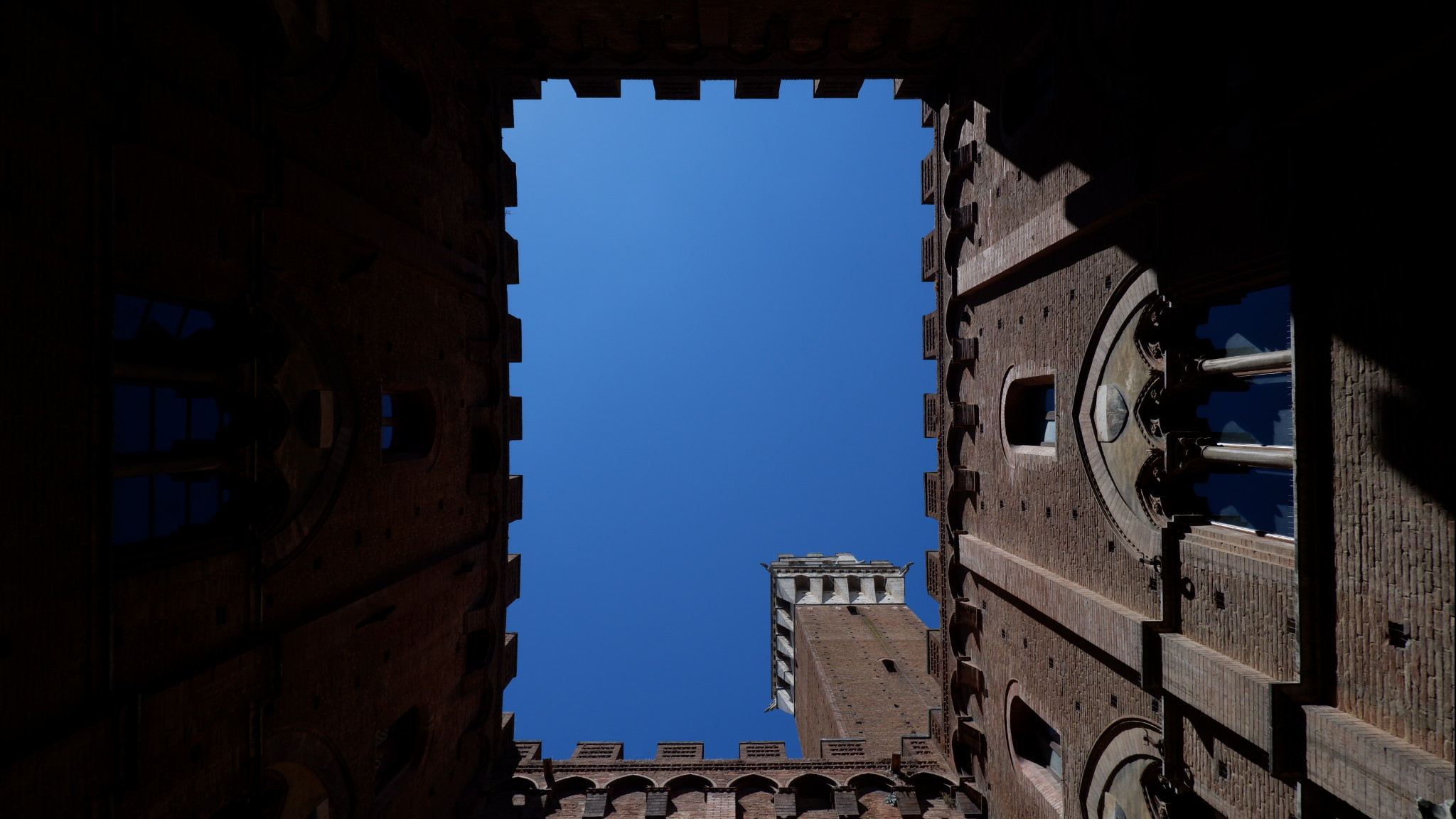 Here is the view of the sky and the architecture from the inner part of the main palace in Piazza del Campo, Siena.