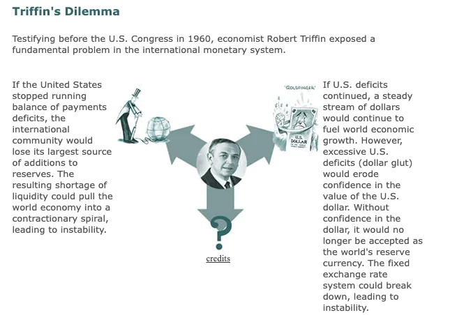 the mind-blowing realization that really made bitcoin click for me was the epiphany that it solves Triffin's dilemma. Triffin's dilemma is an old paradox in macro economics was pointed out by an economist named Robert Triffn in the early 1960s in front of Congress, most of his work had been exploring the interlay of global reserve, currencies, and how they rise and fall, and he famously had predicted that the US dollar would lose reserve currency status because of the fundamental flaw in its design.