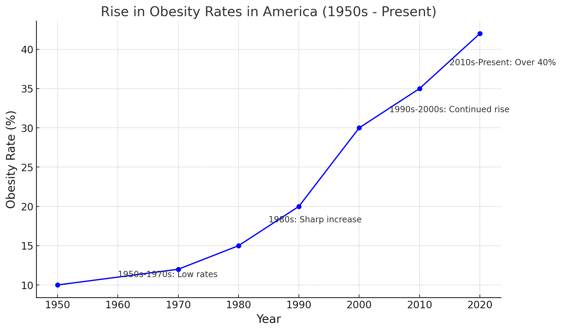 Here is the graph showing the rise in obesity rates in America from the 1950s to the present. It highlights the gradual increase, with significant jumps starting in the 1980s and continuing through the 2010s.