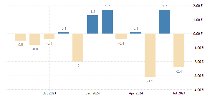 In Germany, July’s industrial production dropped by a staggering 2.4% month-on-month, far below the previous 1.4% rise and significantly worse than the expected -0.5%. On a year-on-year basis, the fall was even more dramatic at -5.3%, a clear deterioration from the previous -4.1% and well below the forecast of -3.5%.