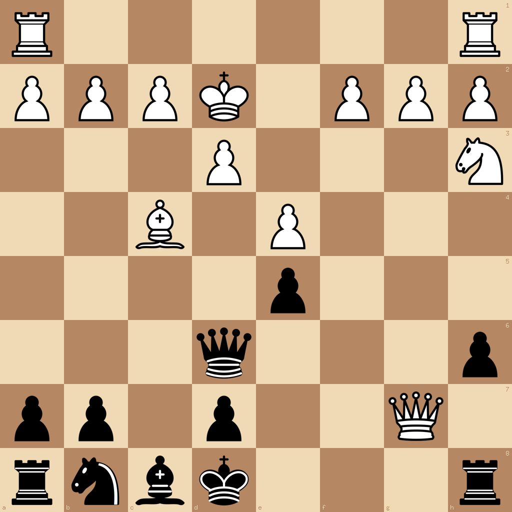 1.e4 Nf6 2.Nc3 Ng4 3.Nh3 e5 4.Qxg4 h6 5.Bc4 Qf6 6.Nd5 Qg6 7.Qf3 Qc6 8.Nxc7+ Qxc7 9.Qxf7+ Kd8 10.d3 Bb4+ 11.Bd2 Bxd2+ 12.Kxd2 Qd6