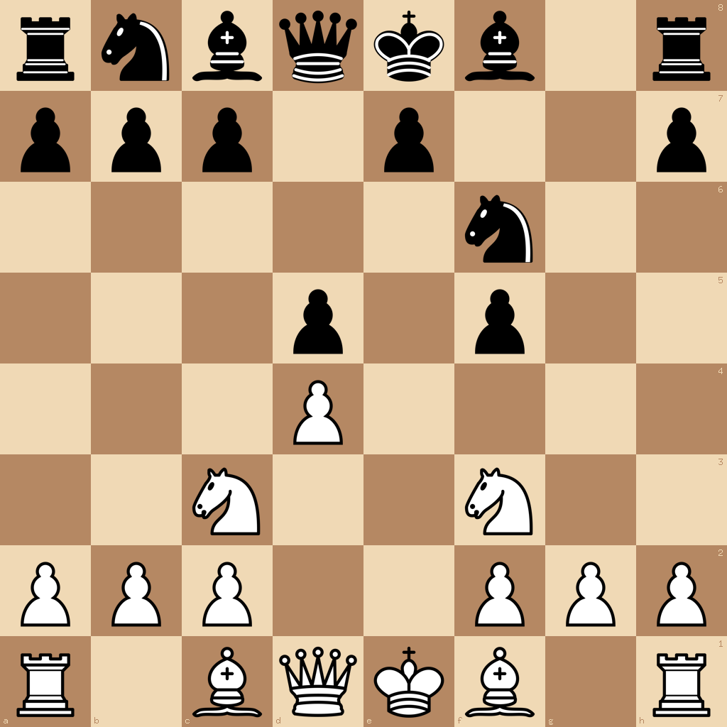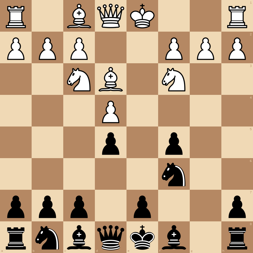 1.e4 g6 2.d4 f5 3.exf5 gxf5 4.Nc3 d5 5.Nf3 Nf6 6.Bd3