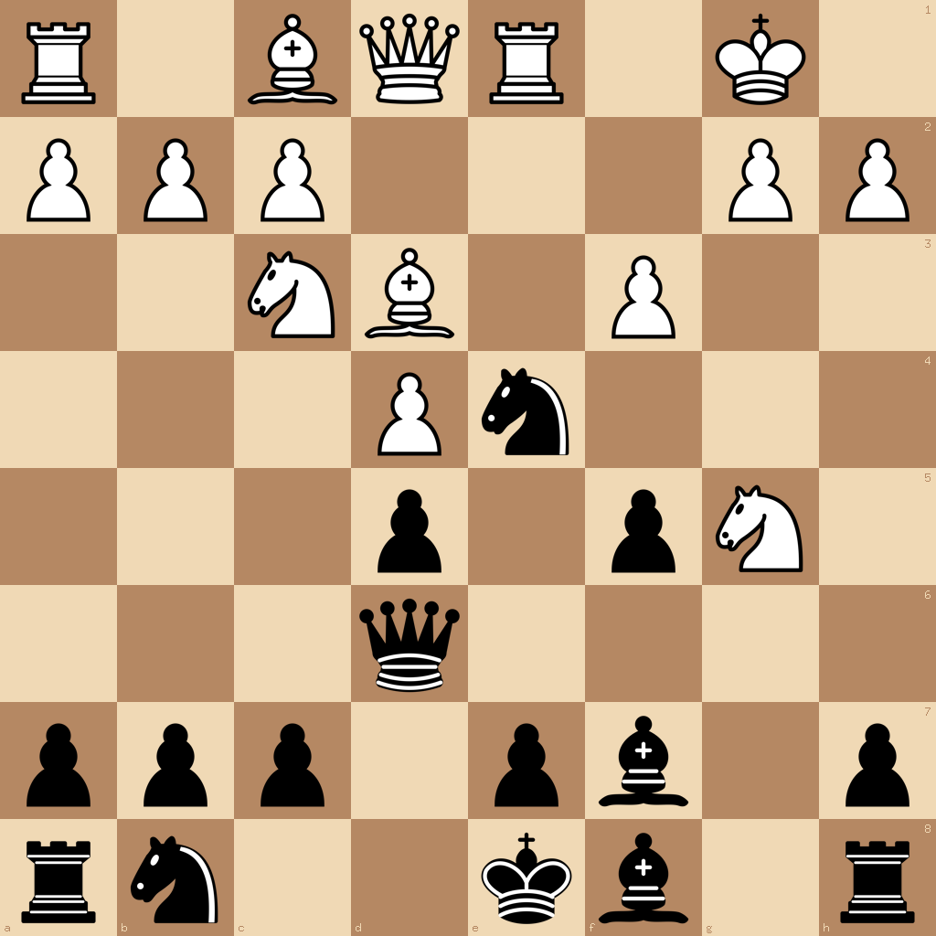 1.e4 g6 2.d4 f5 3.exf5 gxf5 4.Nc3 d5 5.Nf3 Nf6 6.Bd3 Be6 7.O-O Qd6 8.Re1 Ne4 9.Ng5 Bf7 10.f3
