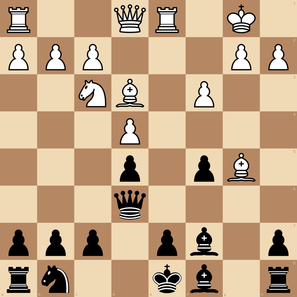 1.e4 g6 2.d4 f5 3.exf5 gxf5 4.Nc3 d5 5.Nf3 Nf6 6.Bd3 Be6 7.O-O Qd6 8.Re1 Ne4 9.Ng5 Bf7