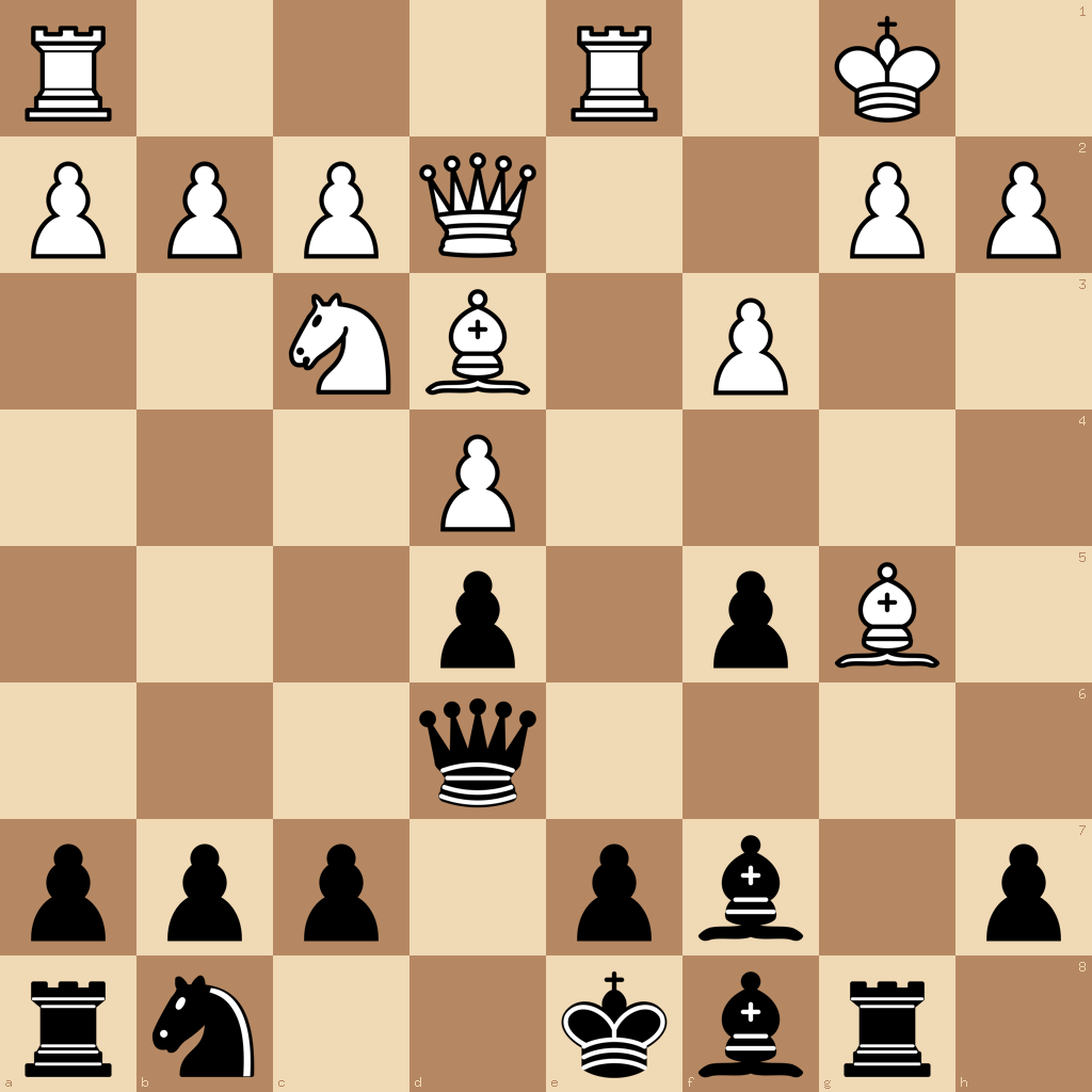 1.e4 g6 2.d4 f5 3.exf5 gxf5 4.Nc3 d5 5.Nf3 Nf6 6.Bd3 Be6 7.O-O Qd6 8.Re1 Ne4 9.Ng5 Bf7 10.f3 Nxg5 11.Bxg5 Rg8 12.Qd2