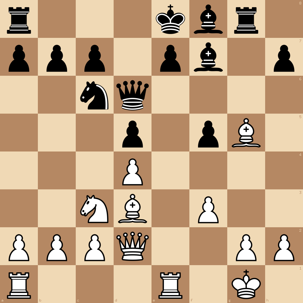 1.e4 g6 2.d4 f5 3.exf5 gxf5 4.Nc3 d5 5.Nf3 Nf6 6.Bd3 Be6 7.O-O Qd6 8.Re1 Ne4 9.Ng5 Bf7 10.f3 Nxg5 11.Bxg5 Rg8 12.Qd2 Nc6