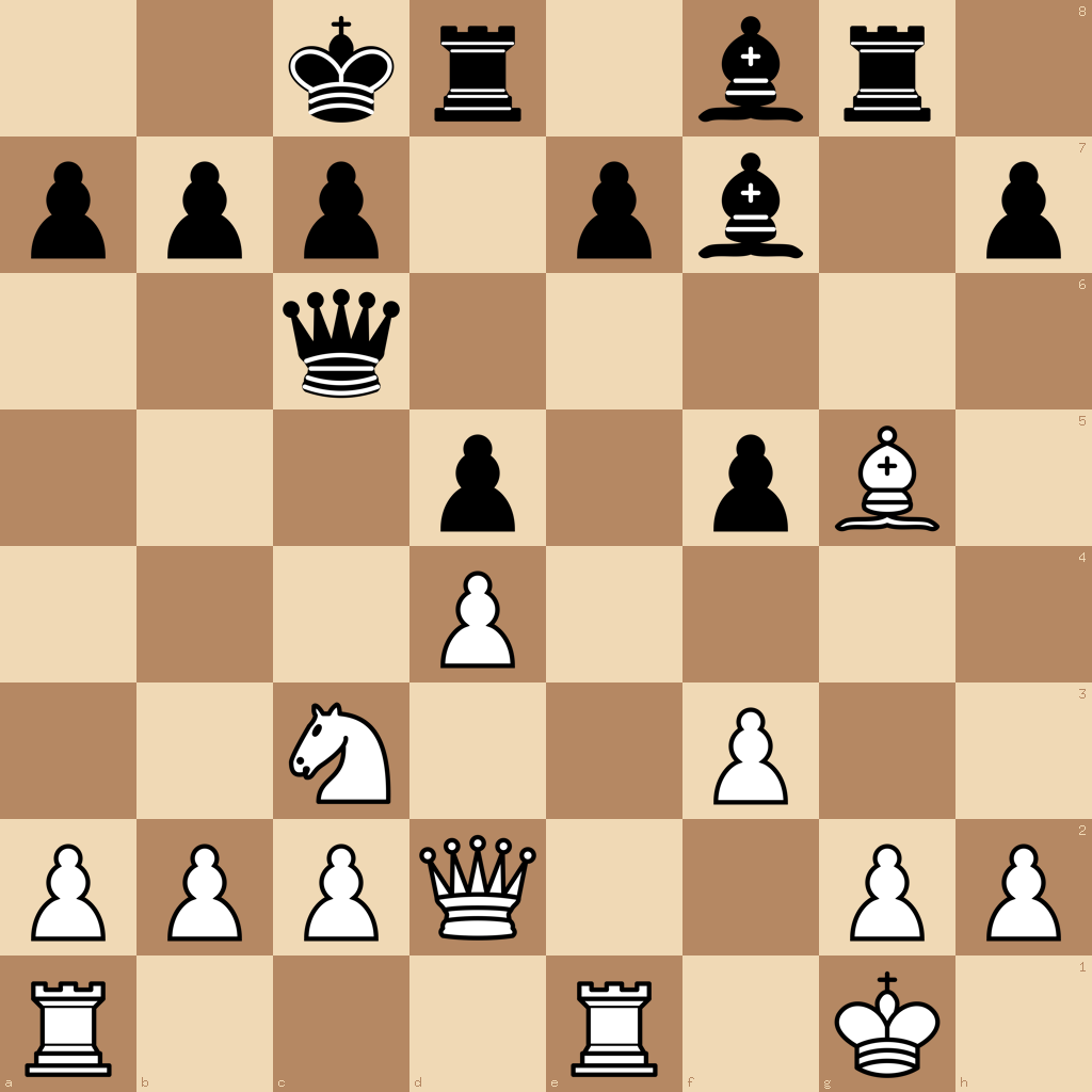 1.e4 g6 2.d4 f5 3.exf5 gxf5 4.Nc3 d5 5.Nf3 Nf6 6.Bd3 Be6 7.O-O Qd6 8.Re1 Ne4 9.Ng5 Bf7 10.f3 Nxg5 11.Bxg5 Rg8 12.Qd2 Nc6 13.Bb5 O-O-O 14.Bxc6 Qxc6 15.Re5