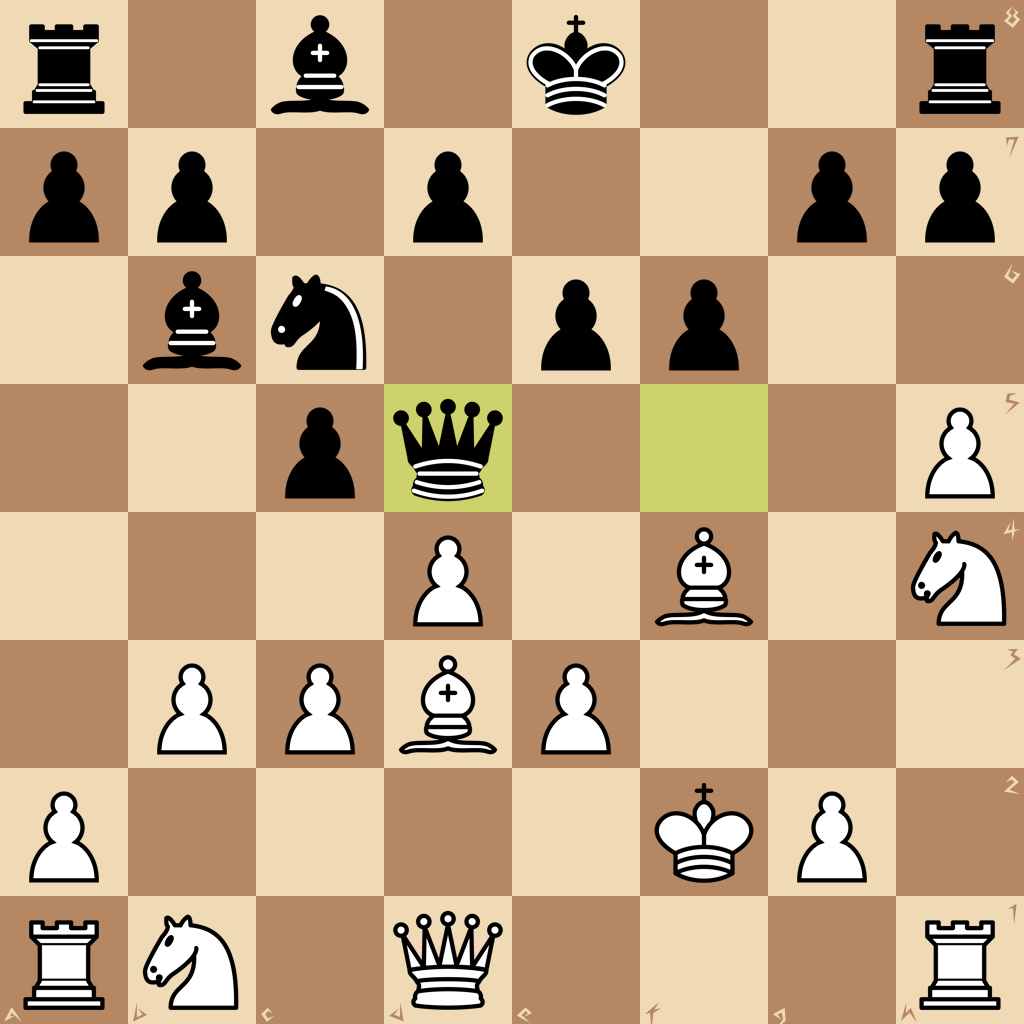 1.h3 e6 2.b3 Qf6 3.c3 Bc5 4.d4 Bb6 5.Nf3 c5 6.Bg5 Qg6 7.e3 Nf6 8.Bd3 Ne4 9.h4 f6 10.h5 Qf5 11.Bf4 Nc6 12.Nh4 Nf2 13.Kxf2 Qd5