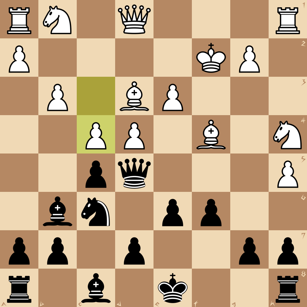 1.h3 e6 2.b3 Qf6 3.c3 Bc5 4.d4 Bb6 5.Nf3 c5 6.Bg5 Qg6 7.e3 Nf6 8.Bd3 Ne4 9.h4 f6 10.h5 Qf5 11.Bf4 Nc6 12.Nh4 Nf2 13.Kxf2 Qd5
