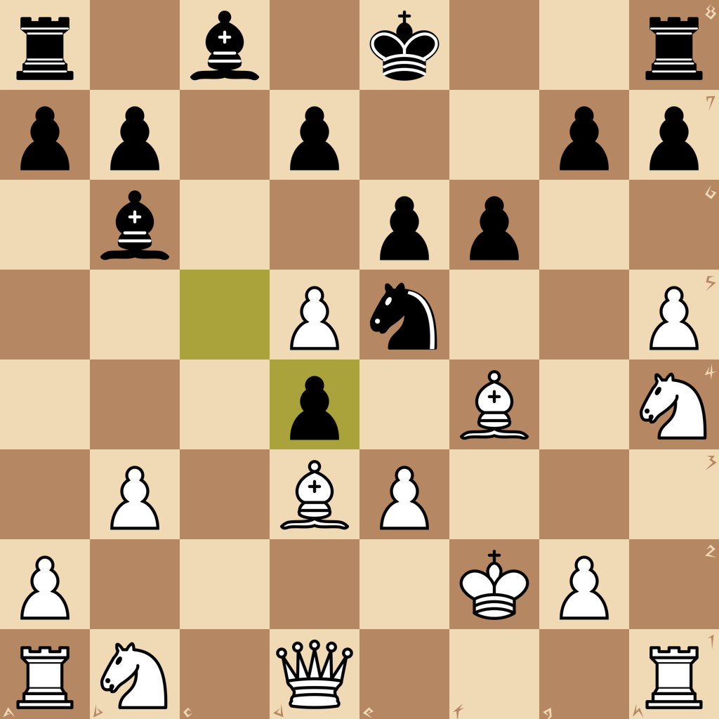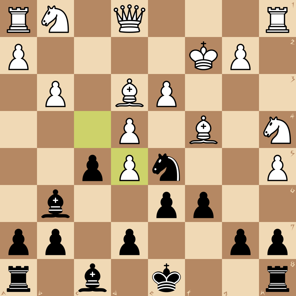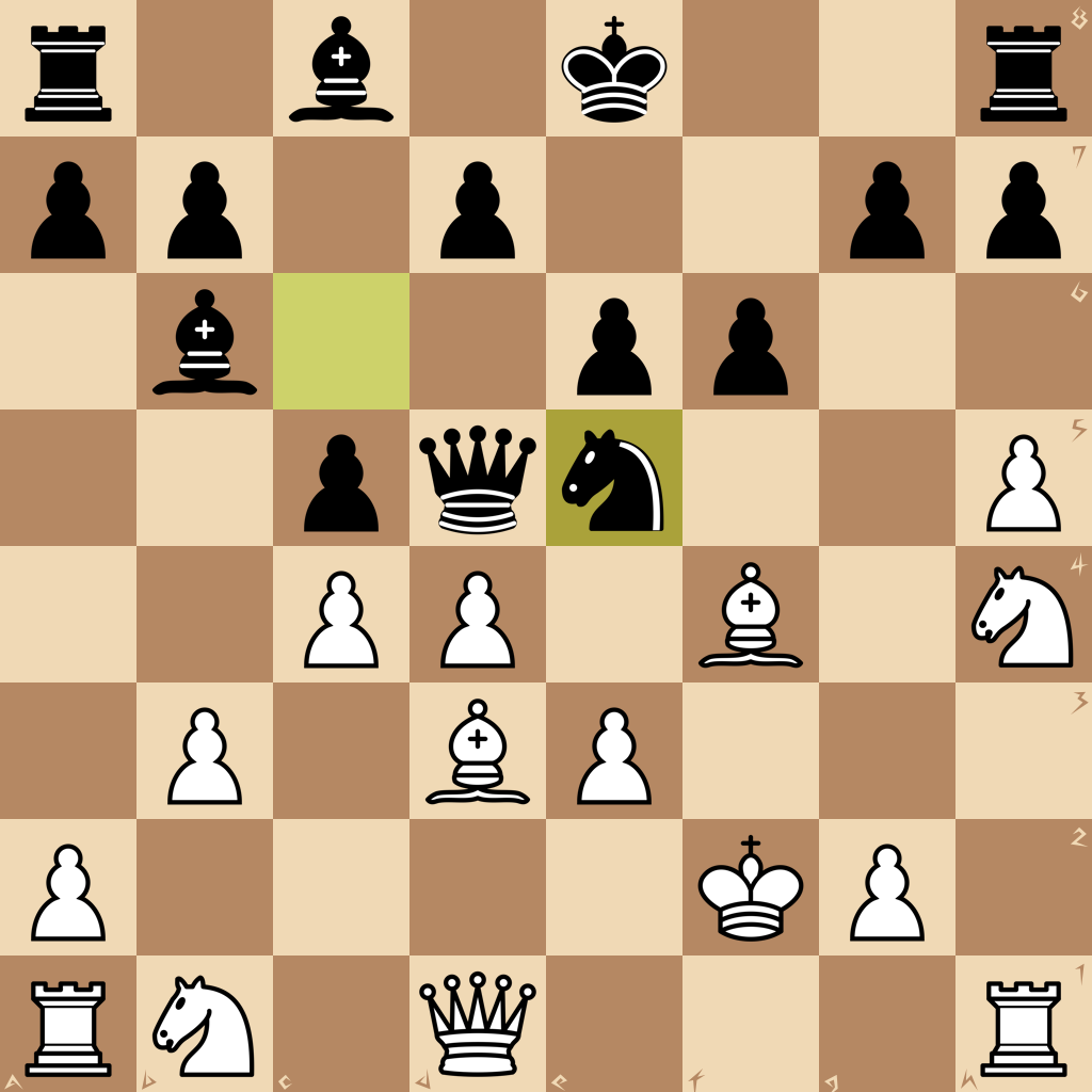1.h3 e6 2.b3 Qf6 3.c3 Bc5 4.d4 Bb6 5.Nf3 c5 6.Bg5 Qg6 7.e3 Nf6 8.Bd3 Ne4 9.h4 f6 10.h5 Qf5 11.Bf4 Nc6 12.Nh4 Nf2 13.Kxf2 Qd5 14.c4 Ne5 15.cxd5 cxd4 16.Na3