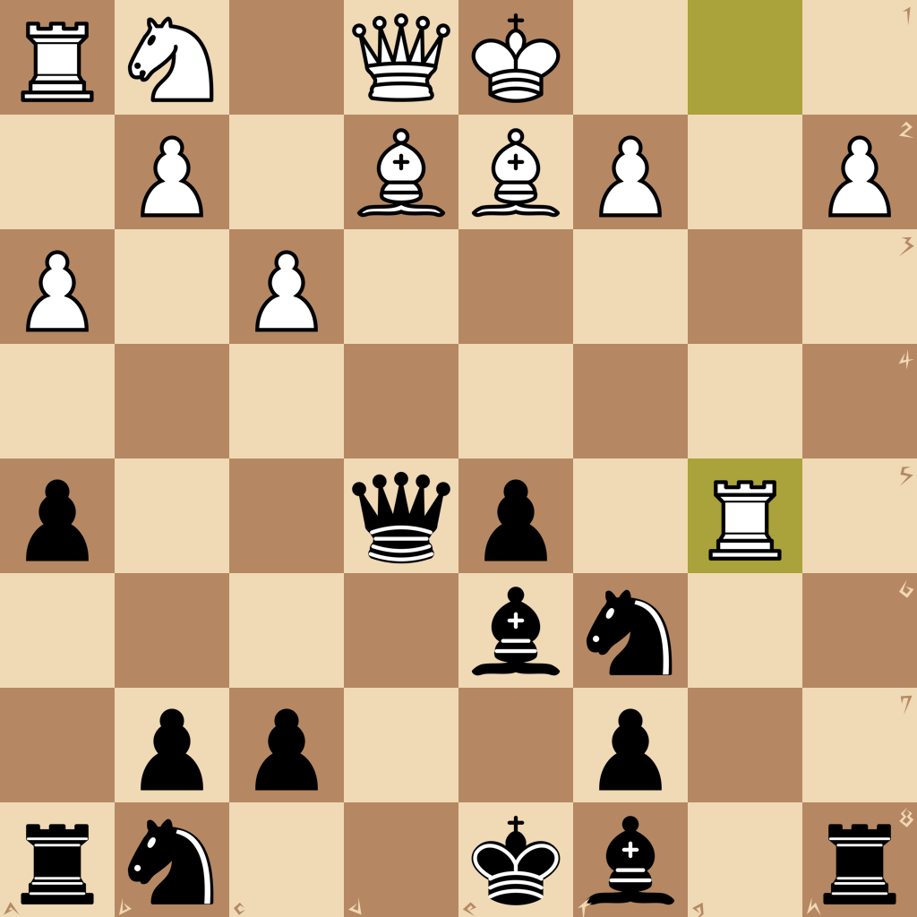 1.d4 a5 2.a3 g5 3.c3 d6 4.Ng1h3 h6 5.g3 e5 6.dxe5 dxe5 7.b1d2 g4 8.Ng1 Qd5 9.Nf3 gxf3 10.Rg1 Be6 11.g4 fxe2 12.Bxe2 Nf6 13.g5 hxg5 14.Rxg5