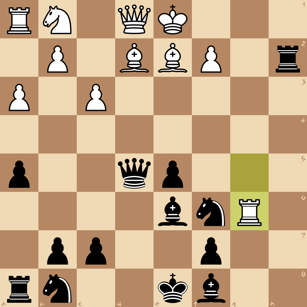 1.d4 a5 2.a3 g5 3.c3 d6 4.Ng1h3 h6 5.g3 e5 6.dxe5 dxe5 7.b1d2 g4 8.Ng1 Qd5 9.Nf3 gxf3 10.Rg1 Be6 11.g4 fxe2 12.Bxe2 Nf6 13.g5 hxg5 14.Rxg5 Rxh2 15.Rg6
