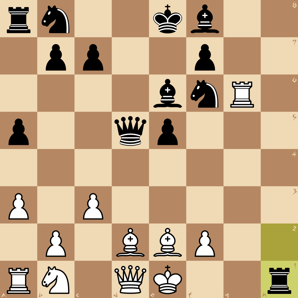 1.d4 a5 2.a3 g5 3.c3 d6 4.Ng1h3 h6 5.g3 e5 6.dxe5 dxe5 7.b1d2 g4 8.Ng1 Qd5 9.Nf3 gxf3 10.Rg1 Be6 11.g4 fxe2 12.Bxe2 Nf6 13.g5 hxg5 14.Rxg5 Rxh2 15.Rg6 Rh1+