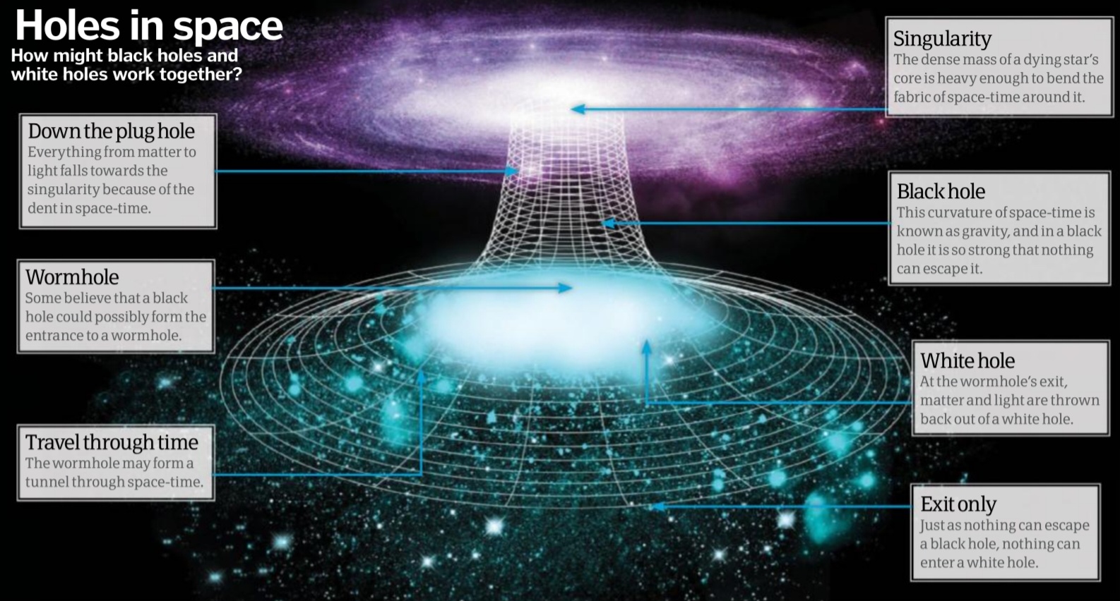 Once a black hole has engulfed as much matter as it can, it may go into reverse, expelling it all back out again to become a white hole. Alternatively, some believe that white holes may be the exit of another type of space hole, the wormhole, while others have suggested that the Big Bang began as a white hole, expelling all the of elements of the universe.
