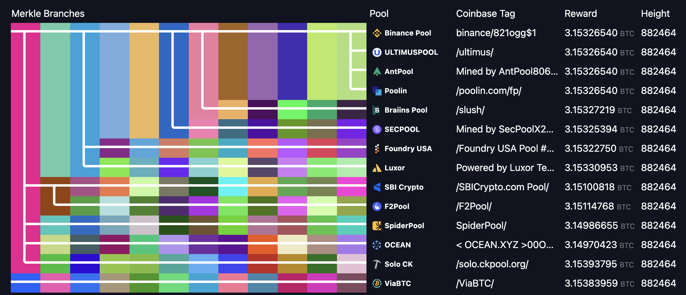 Mining pools make block templates for miners. They send them to miners as what we call jobs. Miners don’t want to hash the whole block - only just enough of the block that it rewards them bitcoin - so they hash the block header which contains a Merkle root. This merkle root changes when the block template changes and can be used to verify a tx is present in a block with JUST a branch of the Merkle tree (which is a binary tree … so a branch size is the log of the number of txs). Because the miner spends the coinbase to the mining pool, and the coinbase is used as an extra nonce (something to mutate the hash of the block header in the hopes it’ll have enough zeros at the front when hashed), the mining pool job contains a Merkle branch that the coinbase can be added to to compute a Merkle root. So this is a visualization of the Merkle branches mining pools are sending their miners. If they’re identical they are coordinating.