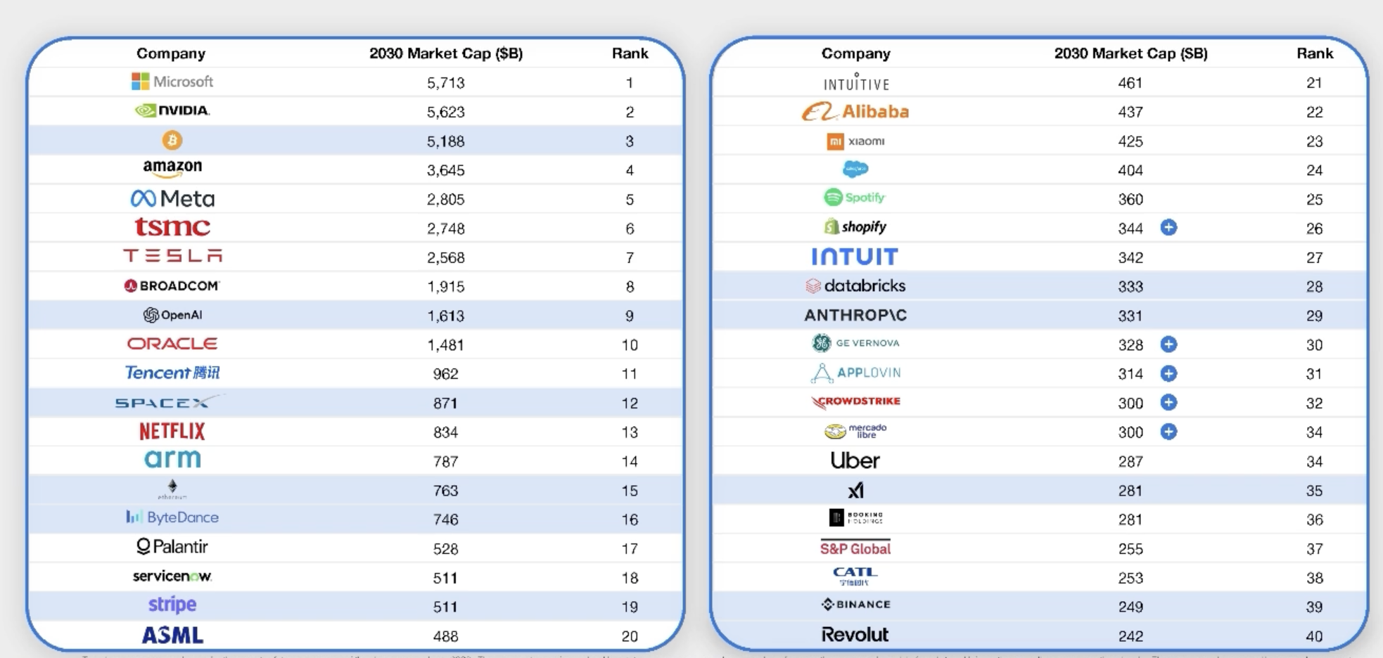 They have this announcement of a fantastic 40 around the end, where they talk about what they believe will have the highest market caps in 2030. They believe that - despite not owning it - Bitcoin will do (only) a 2x. OpenAI would do a 3.5x, Oracle 3x, MS and Nvidia will do less than 2x. Apple is gone, Alphabet gone. Strange list, lol.